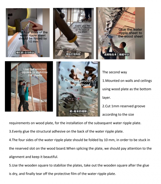 5. Gebruik de houten vierkant om de platen te stabiliseren, verwijder de houten vierkant nadat de lijm droog is en verwijder ten slotte de beschermfolie van de waterrimpelingplaat.